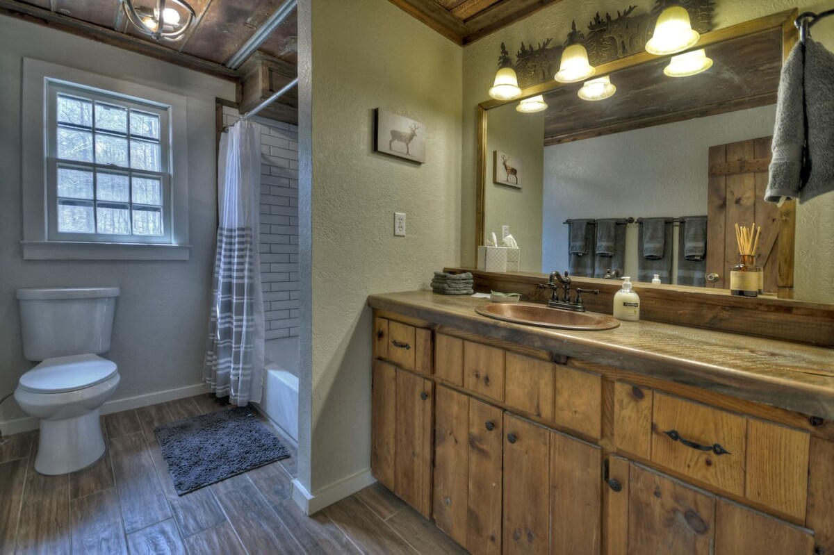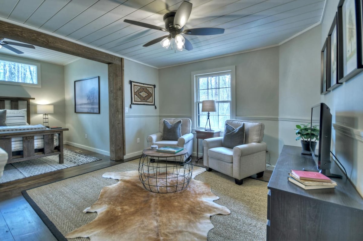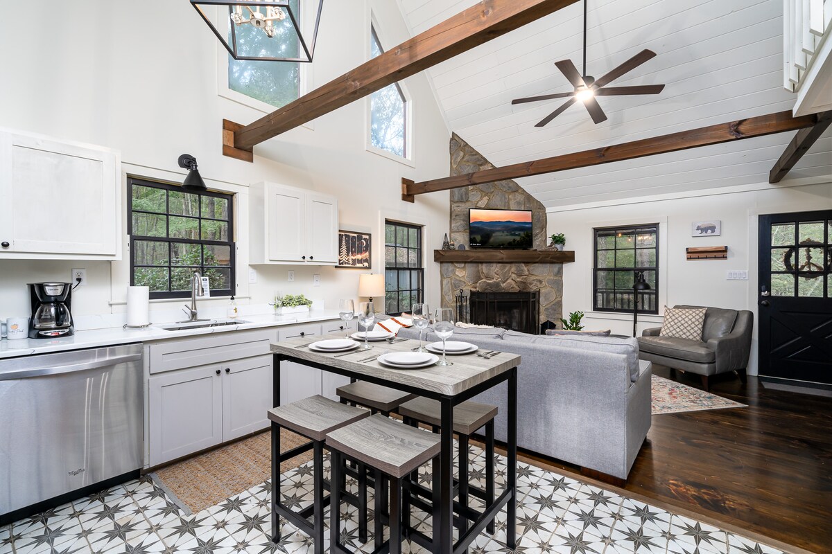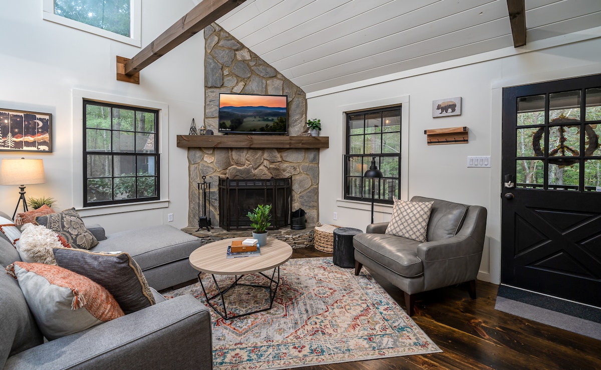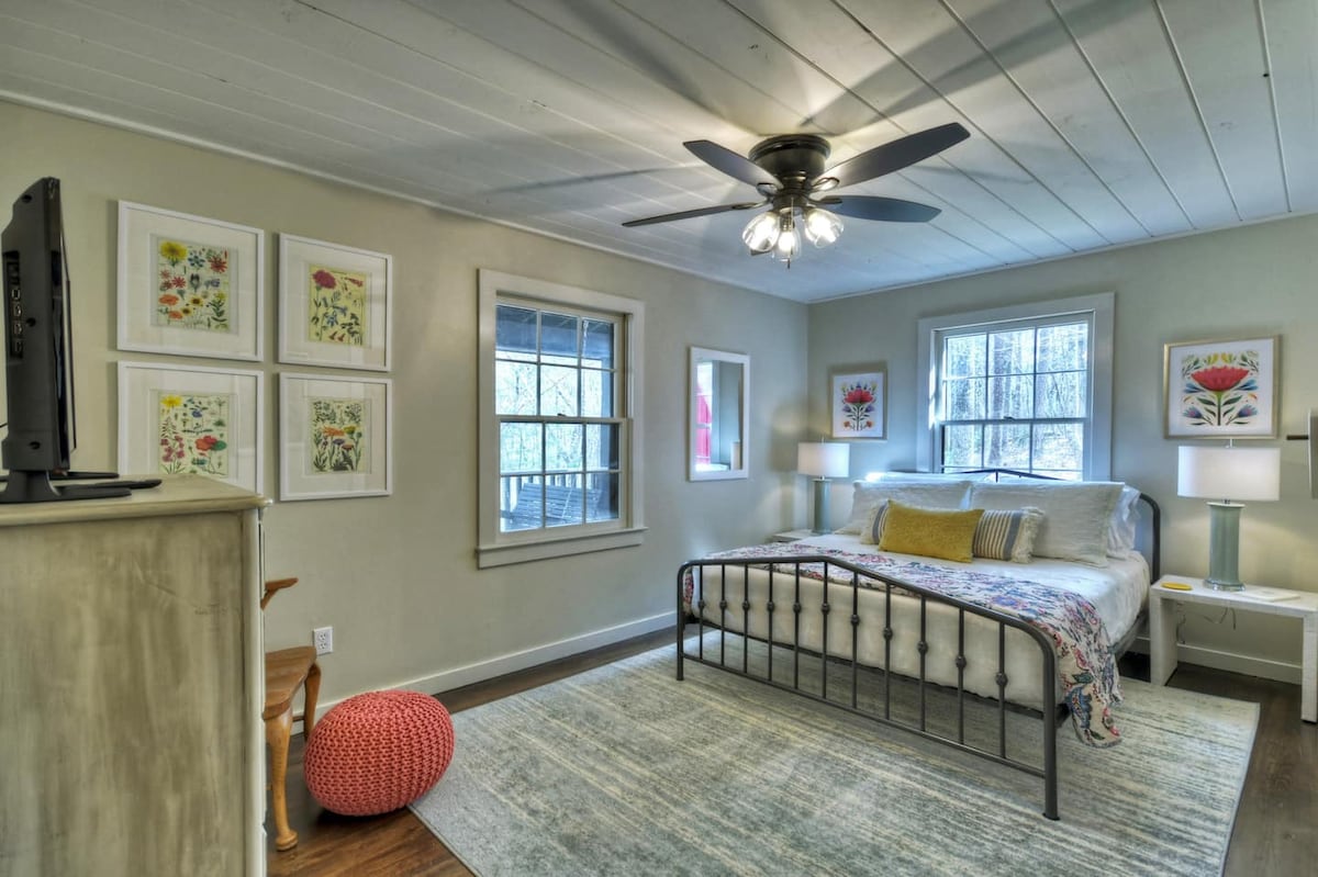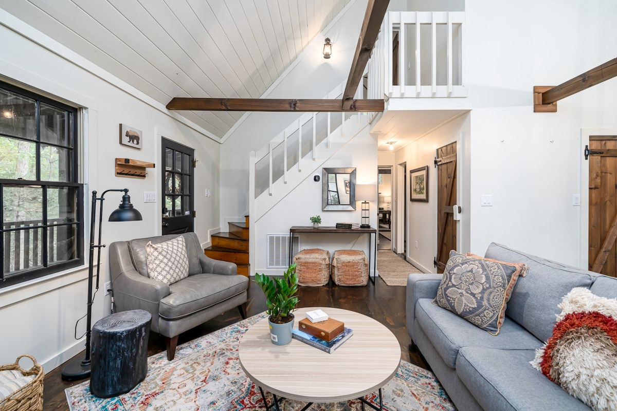 EllijayThe Peaceful Peach: a dreamy, secluded cabin nestled in the woods of the North GA mountains. 5min to Dwtn Ellijay & 15min to Dwtn Blue Ridge. A long downhill dirt road driveway leads you to your private wooded oasis. Start your day with a hot coffee on the front porch, cook together in our fully equipped kitchen, BBQ, make s'mores by the fire pit, stargaze in the hot tub, cozy up by the fireplace & watch a movie after a long day of activities. Comfortably sleeps 6 ♡Perfect for families & couples